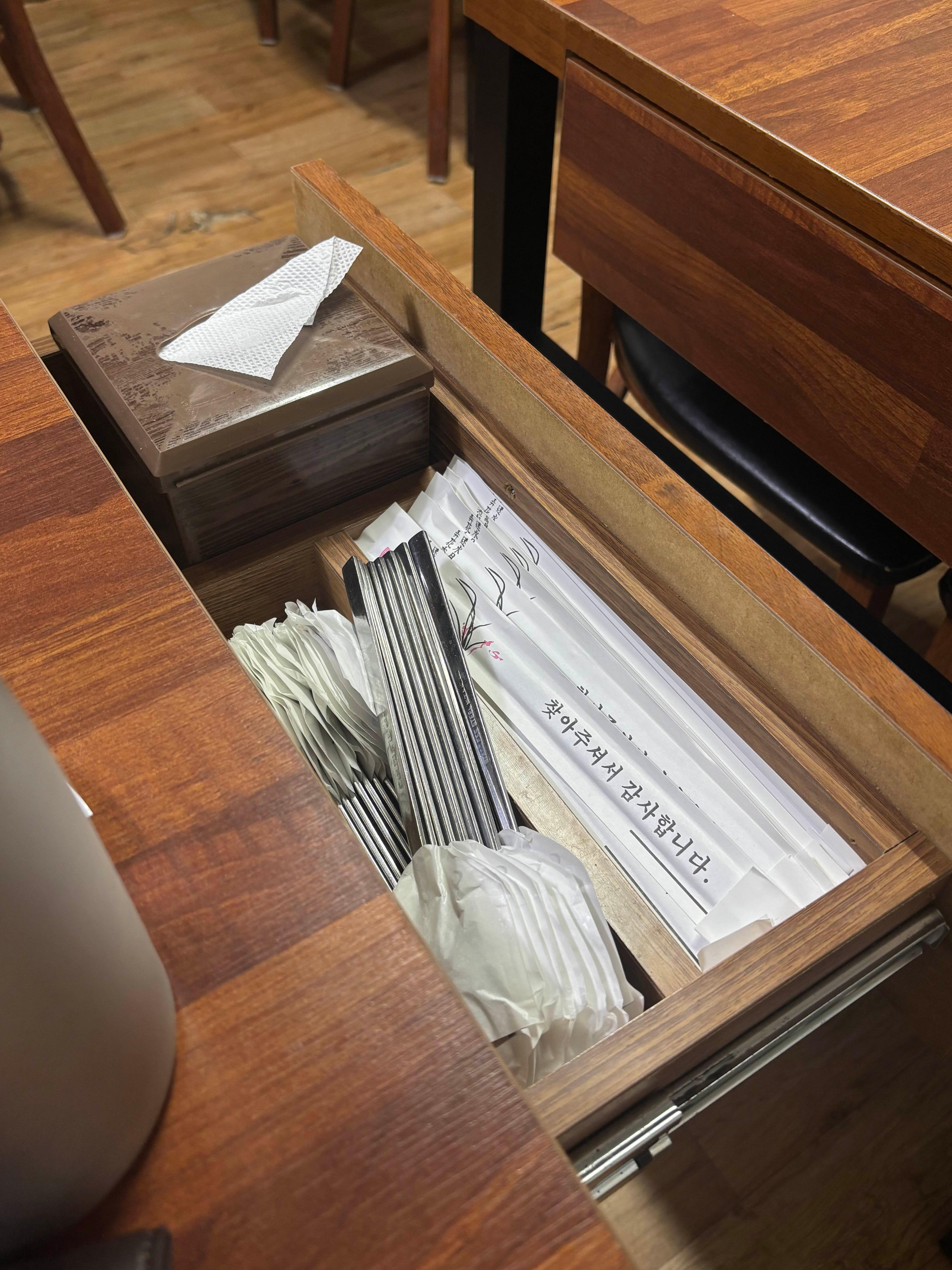 테이블마다 정리된 양념통, 서랍 안에 수저랑 냅킨까지 세심하게 준비돼 있어서 너무 좋았어요.